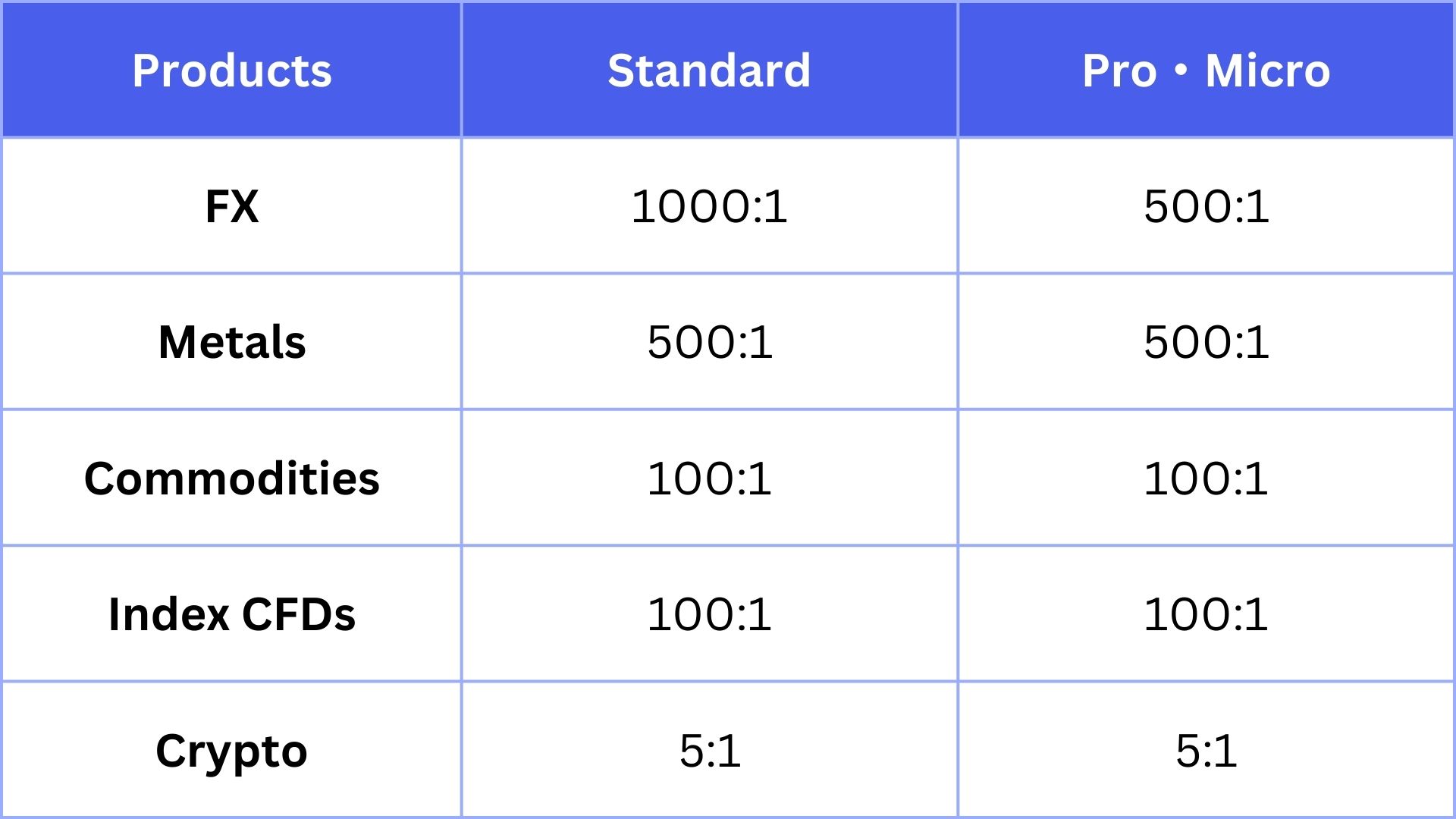 The maximum leverage available for each product is as follows: