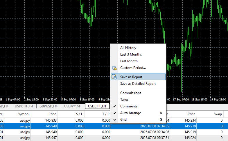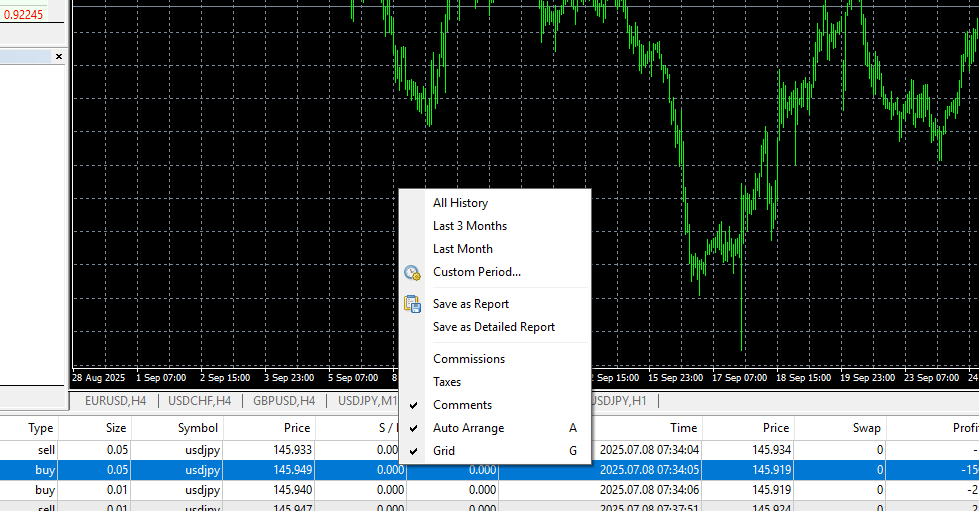 - Right-click within the “Account History” tab in the “Terminal” window.